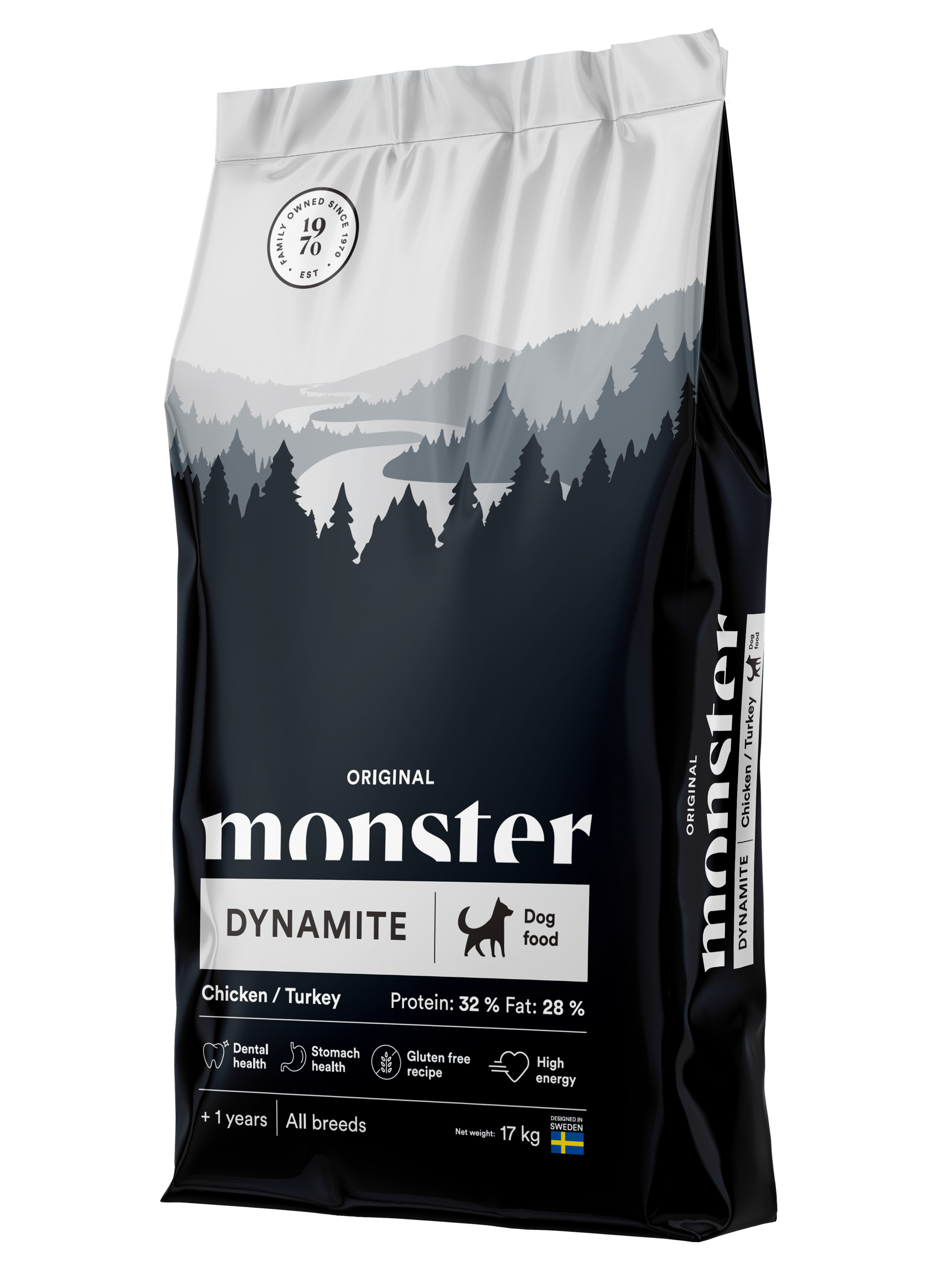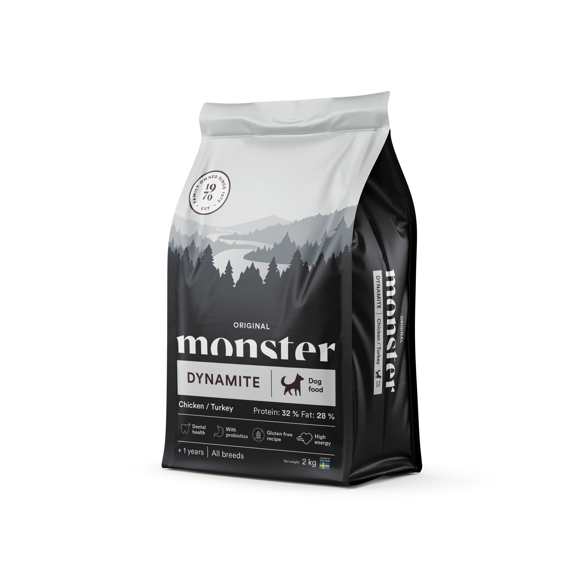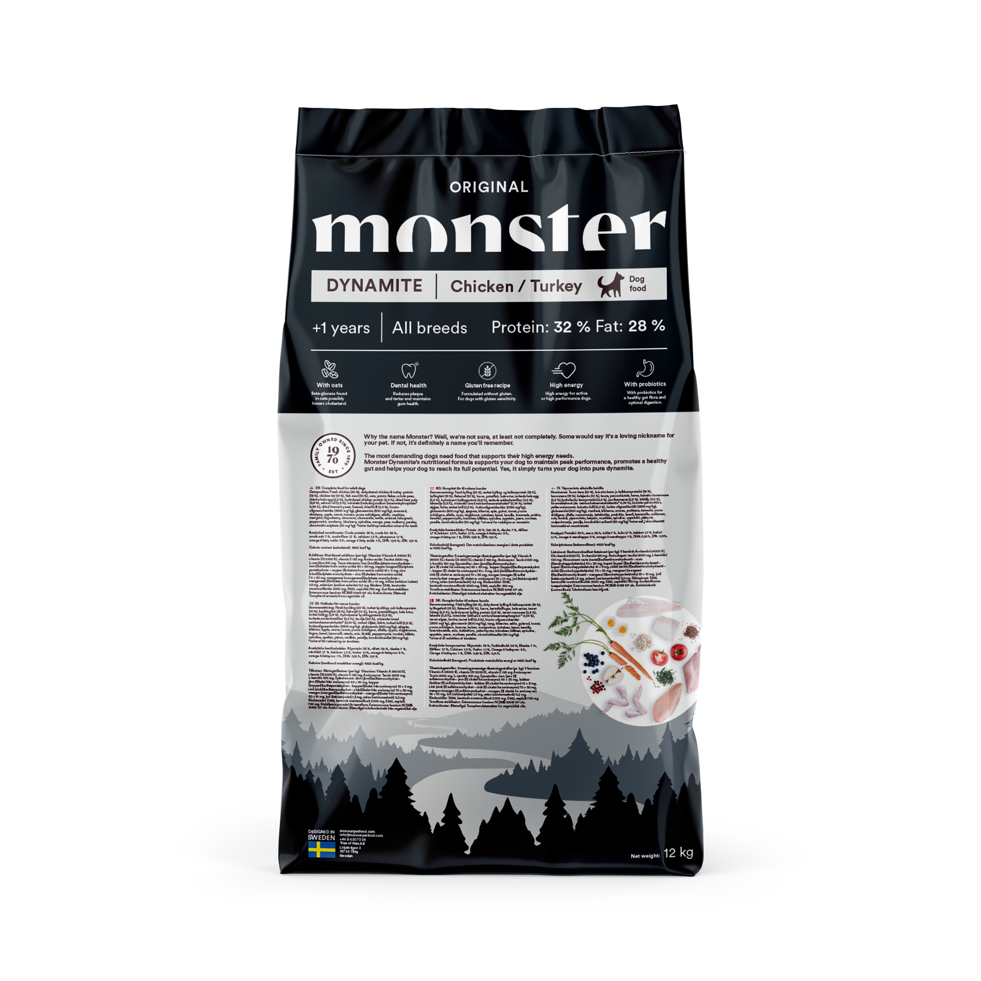 Kröfuhörðustu hundarnir þurfa fóður sem styður mikla orkuþörf þeirra. Næringarsamsetning Monster Dynamite styður hundinn þinn við að viðhalda hámarks frammistöðu, stuðlar að heilbrigðum meltingarvegi og hjálpar hundinum að ná fullum möguleikum sínum.