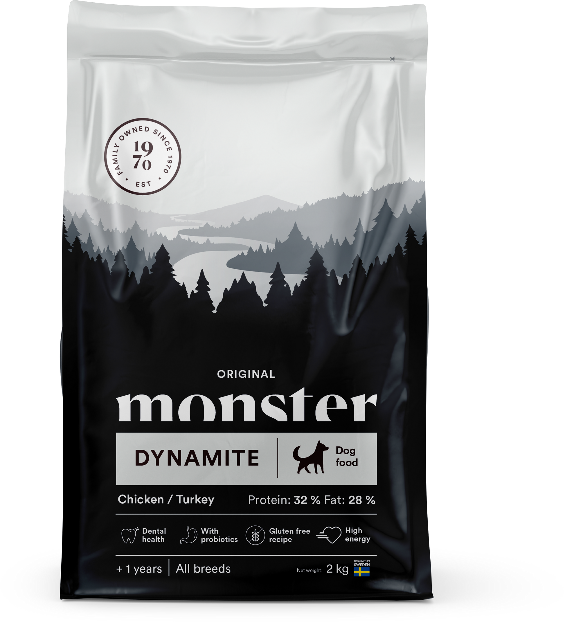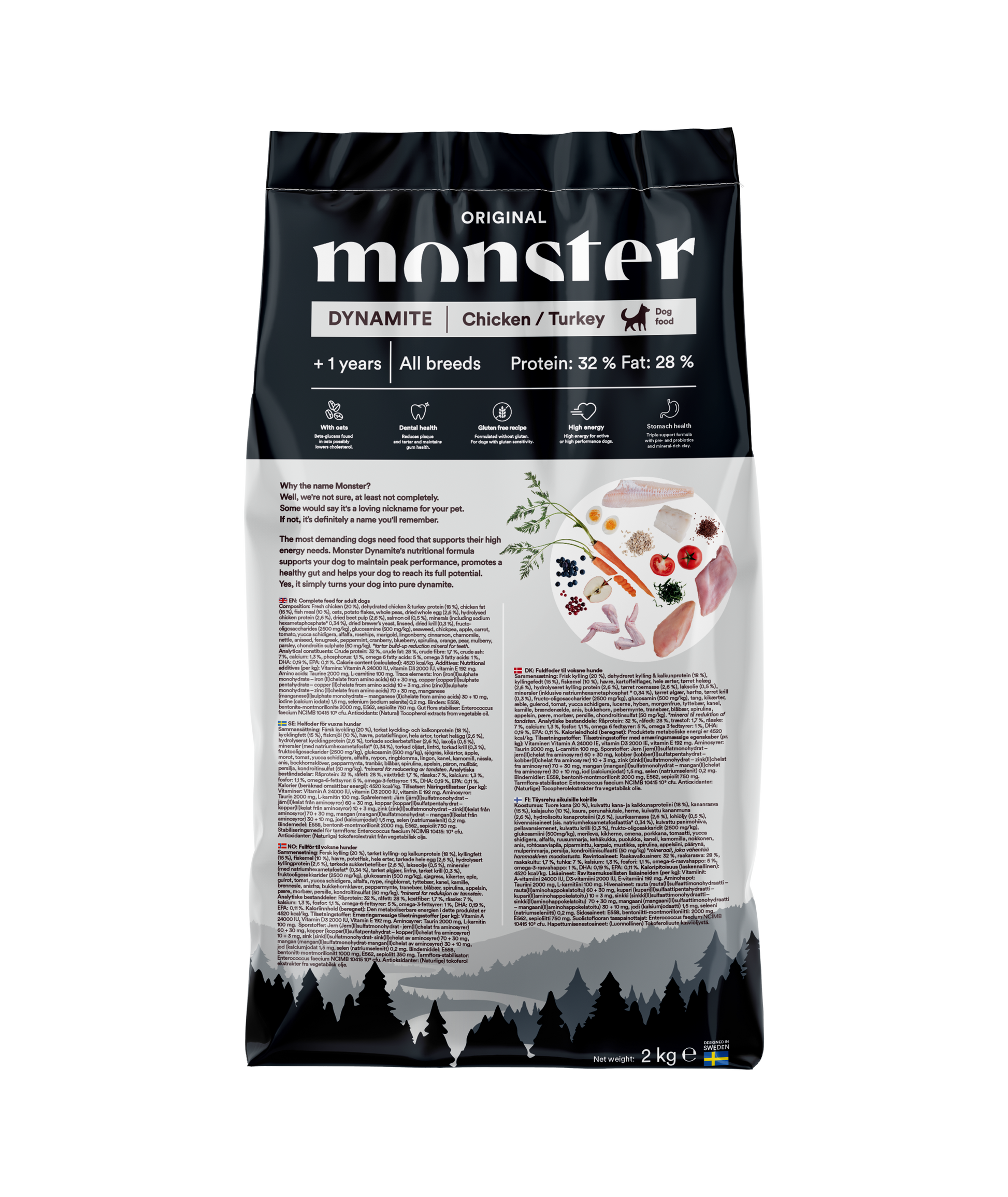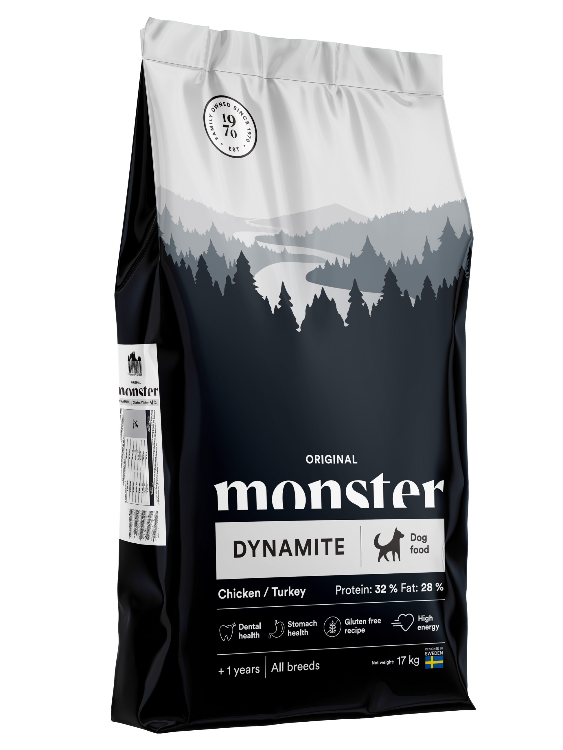 Kröfuhörðustu hundarnir þurfa fóður sem styður mikla orkuþörf þeirra. Næringarsamsetning Monster Dynamite styður hundinn þinn við að viðhalda hámarks frammistöðu, stuðlar að heilbrigðum meltingarvegi og hjálpar hundinum að ná fullum möguleikum sínum.