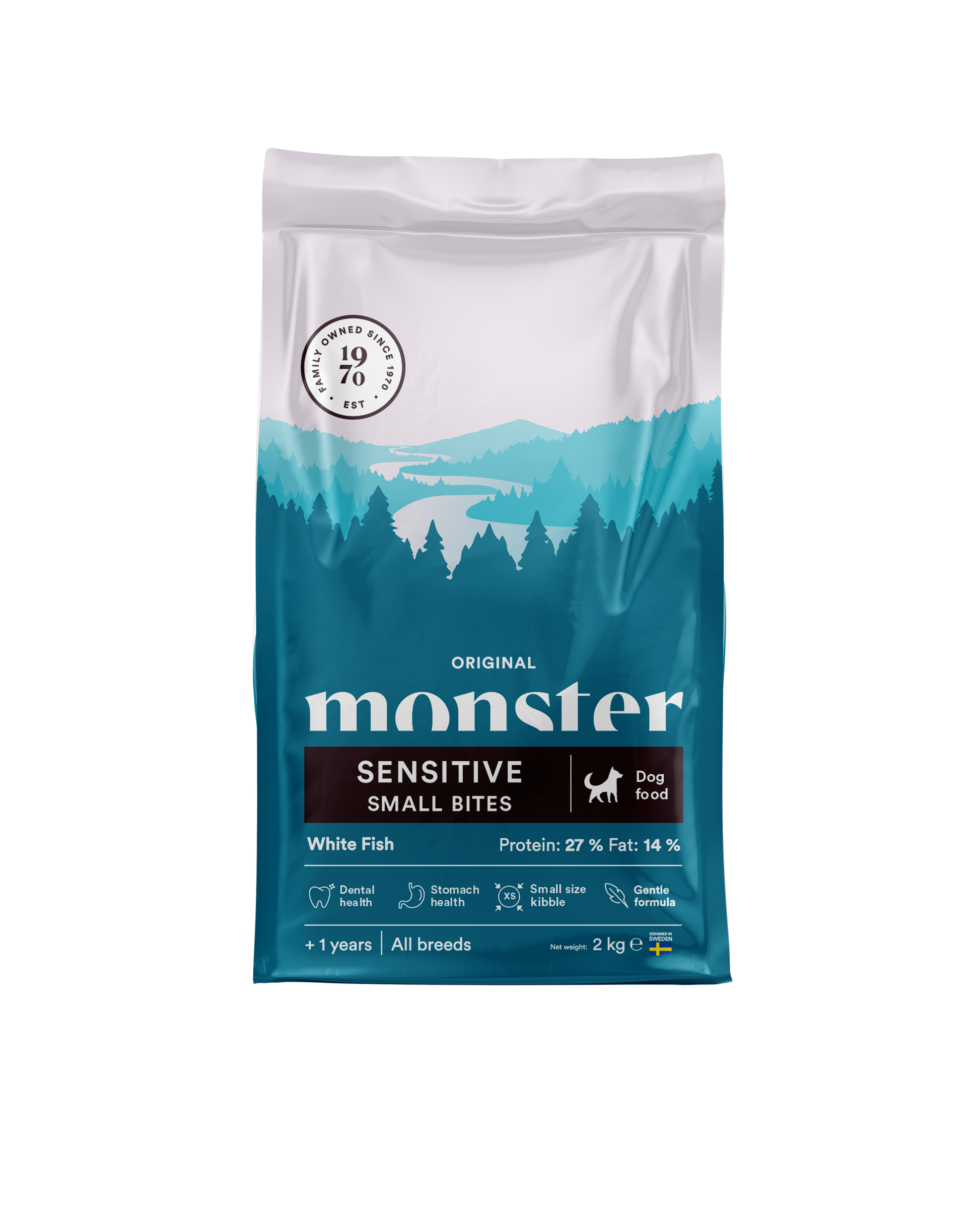 Erfitt að finna fóður sem hentar viðkvæma hundinum þínum þar sem bitarnir eru nógu smáir? Hugsaðu aftur! Hjá Monster er flest hægt! Í þessu fóðri er allt hráefni valið og vandlega sett saman í milda uppskrift. Smáir bitar sem geta skipt miklu máli.